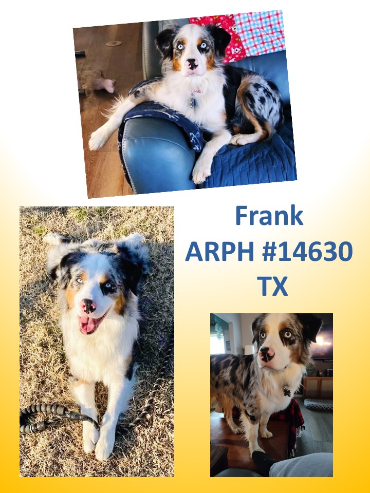 If you are an approved ARPH adopter with a current application on file and interested in learning more about Frank please contact Laura at aussie330@aol.com. If you are interested in becoming an approved ARPH adopter, please submit an adoption application.
